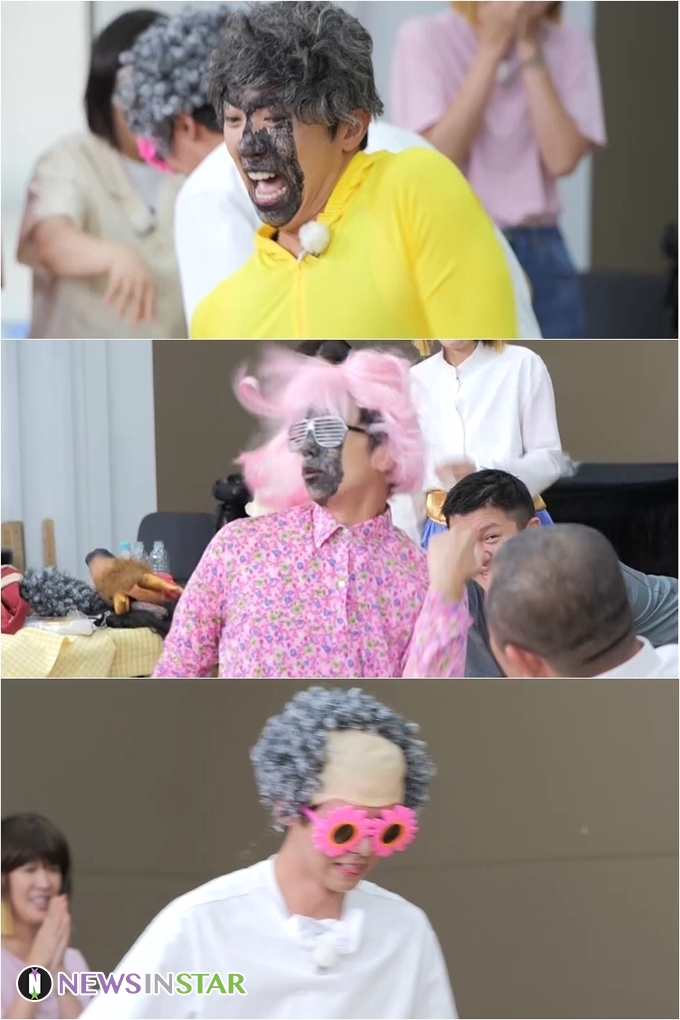 우영의 얼굴은 숯 마사지로 인해 ‘오페라의 유령’ 속 팬텀이 된 상황. 여기에 엎친데 덮친 격으로노란 올인원 타이즈를 착장한 우영은 유인원 댄스까지 펼쳐 멤버들의 배꼽을 강탈해 가기 시작했다. 특히 그 어느때보다 진지한 얼굴 표정으로 댄스 삼매경에 빠져 현장을 혼돈의 도가니로 몰아넣었다는 후문이다. 그런데 여기서 끝이 아니었다. 이번에는 분홍 긴머리 가발을 눌러쓴 우영이 꽃무늬 블라우스에 몸빼바지를 착장한 채 로봇 섹시댄스를 선보이기 시작했는데 터미네이터가 등장하는듯 직접 입으로 효과음까지 곁들어 충격에 사로잡힌 김숙이 “이건 재능 낭비야”라고 외쳤다는 전언이다.