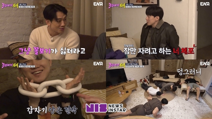 오늘(4일) 방송되는 ENA ‘크레이지 투어’ 6회에서는 튀르키예 이스탄불 숙소에서의 멤버들의 리얼한 밤 풍경이 공개된다. 한밤중에도 짐(Gym)을 찾는 ‘운동 광인’ 비와 달리, 빠니보틀은 “잘 사람은 자고, 짐에 갈 사람은 가자”라며 침대와의 물아일체를 선언한다. 하지만 이를 지켜보던 ‘맑눈광’ 김무열이 돌변, 갑자기 빠니보틀의 양손을 결박하며 ‘취침 금지’ 체포 작전에 나서 현장을 폭소케 한다.