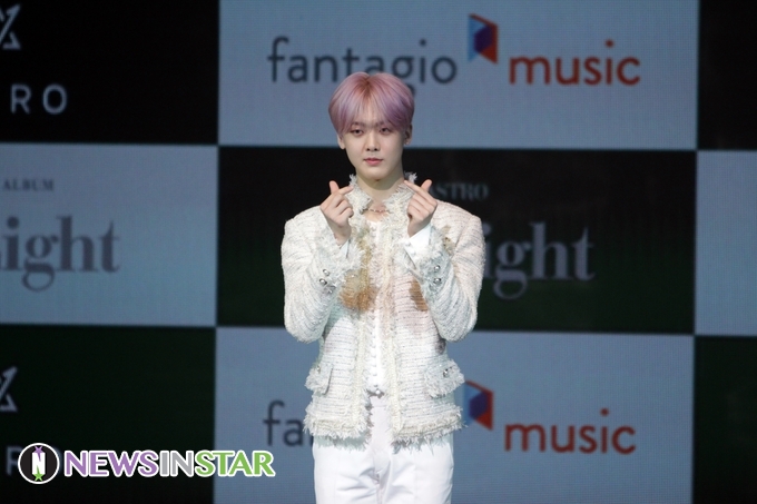 16일 오후 서울시 강남구 삼성동 코엑스 아티움에서 '아스트로(ASTRO)' 첫번째 정규 앨범 ‘올라잇(All Night)’ 발매 쇼케이스가 열려 윤산하가 포토타임에 포즈를 취하고 있다.
