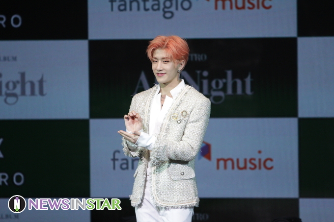 16일 오후 서울시 강남구 삼성동 코엑스 아티움에서 '아스트로(ASTRO)' 첫번째 정규 앨범 ‘올라잇(All Night)’ 발매 쇼케이스가 열려 진진이 포토타임에 포즈를 취하고 있다.