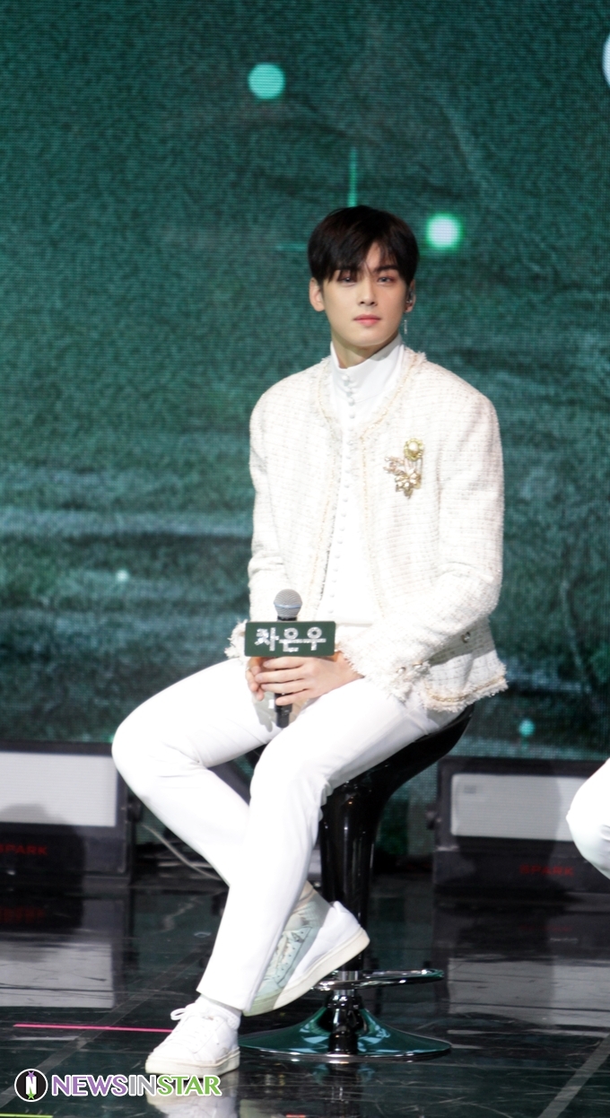 16일 오후 서울시 강남구 삼성동 코엑스 아티움에서 '아스트로(ASTRO)' 첫번째 정규 앨범 ‘올라잇(All Night)’ 발매 쇼케이스가 열려 차은우가 포토타임에 포즈를 취하고 있다.