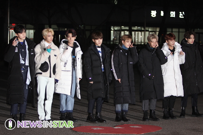 2월 1일 오전 서울시 영등포구 여의도 KBS 신관 공개홀에서 열린 '뮤직뱅크' 출근길에 ATEEZ가 참석해 포즈를 취하고 있다.