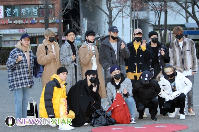 2월 1일 오전 서울시 영등포구 여의도 KBS 신관 공개홀에서 열린 '뮤직뱅크' 출근길에 세븐틴이 참석해 포즈를 취하고 있다.
