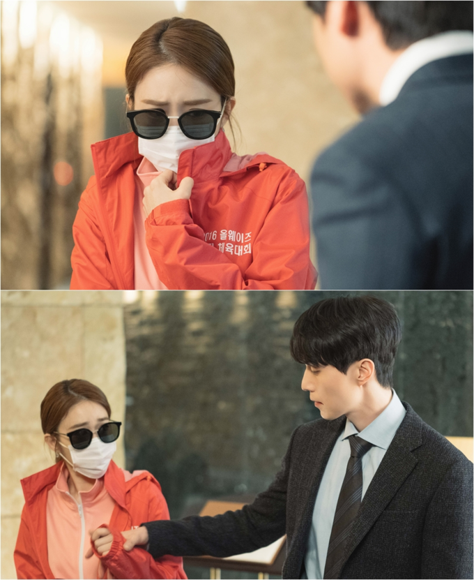 공개된 스틸 속 오진심은 정체를 감추기 위해 중무장한 모습으로 시선을 사로잡는다. 선글라스와 마스크로 얼굴을 가린 것도 모자라, 평소라면 절대 입지 않을 법한 올웨이즈 로펌 체육대회 트레이닝복까지 갖춰 입은 것. 그러나 완벽한 변장에도 우주여신 포스가 가려지지 않았는지, 정체를 눈치챈 듯 다가오는 남성의 앞에 몸을 잔뜩 움츠린 오진심의 모습이 관심을 높인다. 그러나 이때 오진심의 손목을 잡은 권정록의 든든한 손길이 포착돼 설렘을 유발한다. 위장취업이 탄로나기 일보직전인 아슬아슬한 상황에 처한 오진심 앞에 구세주처럼 나타난 권정록의 눈빛과 손길에서 풍겨져 나오는 듬직하고 따뜻한 남성미가 보는 이들의 심장 떨림을 배가시킨다.