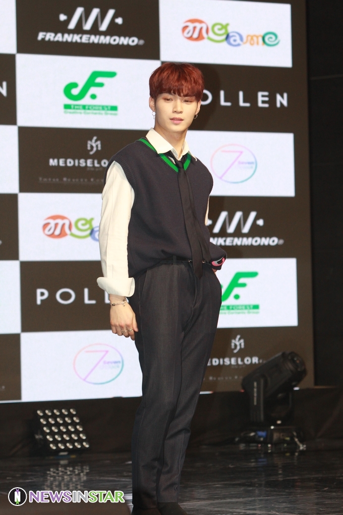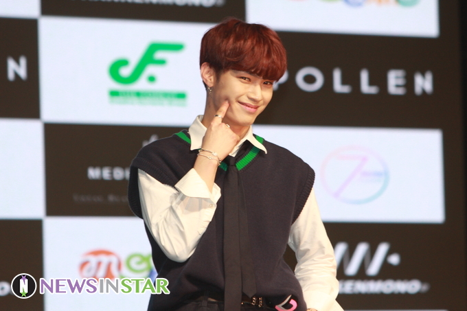 18일 오후, 서울시 중구 롯데피트인에서 그룹 세븐어클락(Seven O'clock)의 첫번째 디지털 싱글앨범 'Get Away' 발매 기념 쇼케이스가 열려 한겸이 참석해 포토타임을 갖고 있다.
