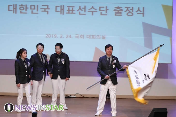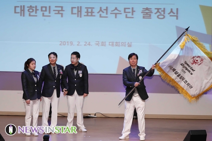 24일 오후 서울시 영등포구 국회의사당 대회의실에서 '2019 아부다비 스페셜올림픽 세계하계대회 한국대표 선수단 출정식' 행사를 개최하여 선수단, 초청인사 및 관계자 280여명이 참석했다.