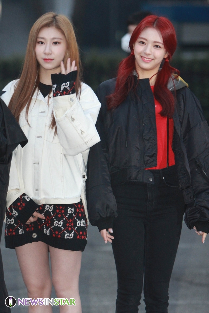 1일 오전 서울시 영등포구 여의도동 KBS 신관 공개홀에서 '뮤직뱅크' 리허설이 열려 있지(ITZY) 채령, 유나가 출근길에 포즈를 취하고 있다.