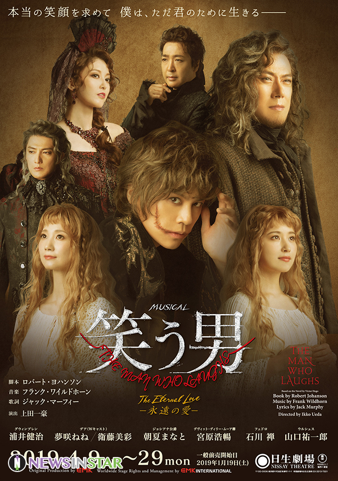일본판 ‘웃는 남자’는 섬세한 연출력을 인정받은 실력파 연출가 우에다 잇코(上田一豪)를 필두로 ‘그윈플렌’ 역에 2017년 제67회 예술선장문부과학대신 시상식에서 신인상을 수상한 스타 배우 우라이 켄지(浦井健治)가 열연을 펼치고 있다. 이와 함께 ‘우르수스’역에 뮤지컬 ‘엘리자벳’의 토드, ‘레미제라블’의 장발장 등 중후한 무게 감으로 무대는 물론 TV드라마 분야에서도 확고한 입지를 다지고 있는 일본의 국민배우 야마구치 유이치로(山口祐一郎), ‘데아’ 역에 유메사키 네네(夢咲ねね), 에토 미사(衛藤美彩), ‘조시아나’역에 아사카 마나토(朝夏まなと) 등 화제의 캐스트가 출연한다.