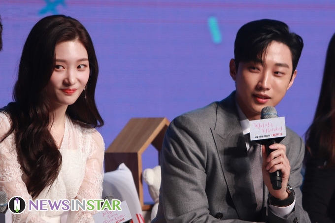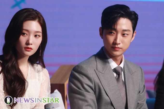 12일 오전 서울시 영등포구 여의도동 콘래드 서울에서 넷플릭스 오리지널 시리즈 '첫사랑은 처음이어서' 제작발표회가 열려 정채연, 진영이 참석해 질의 응답을 하고 있다.