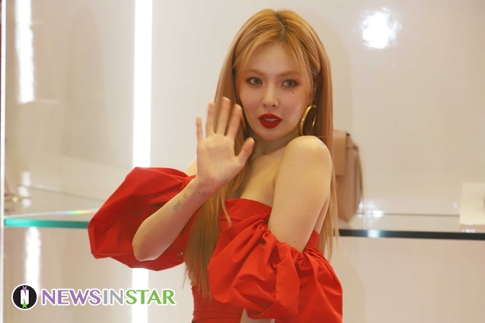 20일 오후 대구광역시 동구 신암동 럭셔리 브랜드 '발렌티노(VALENTINO)'가 신세계백화점 대구점에서 '브이링(VRING)'백 팝업 스토어 오픈 기념 포토콜 행사가 열려  현아가 참석해 포즈를 취하고 있다.