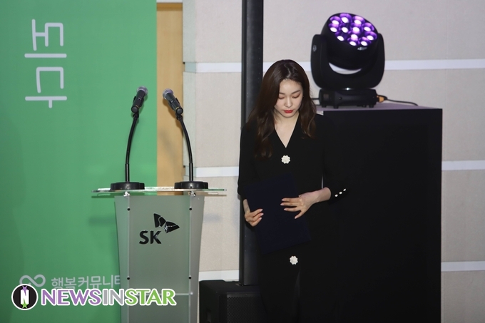 22일 오후 서울시 중구 을지로 SK텔레콤 본사 '행복 커뮤니티 런칭 세레모니'행사가 열려 전 피겨스케이팅 국가대표 김연아가 참석해 'ICT 돌봄 서비스'를 받는 어르신이 보낸 감사 편지를 대신 읽고 있다.