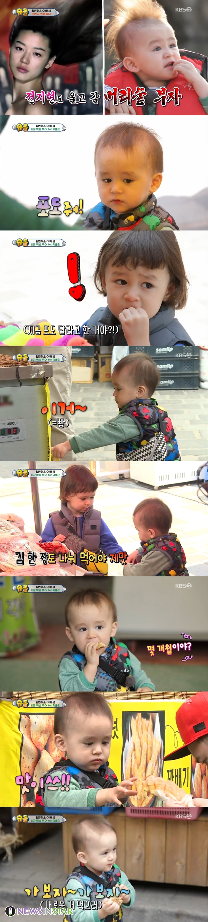 처음으로 말한 단어도 “과자”였던 벤틀리는 시장에서 “포도”, “사줘”, “맛이쓰~” 등 다양한 단어를 내뱉으며 먹방 신동의 위엄을 보여줬다. 뽈뽈뽈 시장을 누비며 귀여운 목소리를 뽐내는 벤틀리의 모습은 시장 전체를 환하게 물들였다. 이와 함께 벤틀리의 옹알이를 들리는 그대로 풀어놓은 ‘슈돌’의 찰떡같은 자막은 웃음을 하드캐리했다.