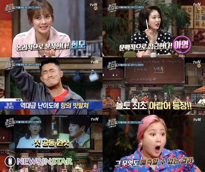 본격적인 받아쓰기가 시작되고 노래가 흘러나오자 신아영은 “라이브로 들었던 노래”라고 말해 기대를 한 몸에 받았다. 박나래도 “이 가수의 음악을 다 들었다”며 남다른 자신감을 드러냈다. 하지만 예상치 못한 역대급 난이도에 멤버들 간 설전이 계속되고, 심지어 김동현은 “다른 나라 말이 나왔다”면서‘놀토’ 최초로 아랍어를 받아쓰기 판에 적어서 현장을 웃음바다로 만들었다.