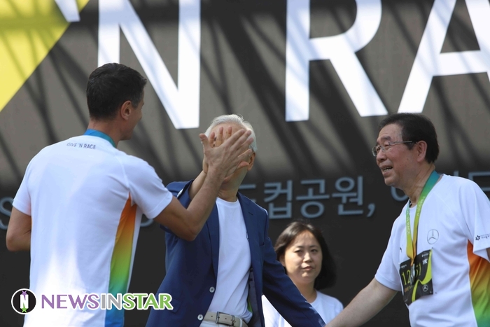 26일 오전 서울시 영등포구 여의도동 여의도공원에서 제4회 메르세데스-벤츠 '기브앤레이스'가 열려 디미트리스 살라키스 메르세데스-벤츠 사회공헌위원회 의장, 박원순 서울특별시장, 이훈규 아이들과미래재단 이사장이 참석해 기념사와 기부금 전달식 행사가  열렸다.