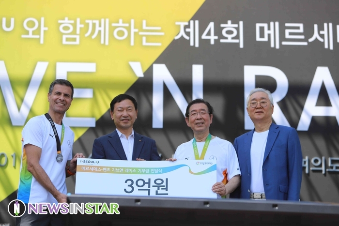 26일 오전 서울시 영등포구 여의도동 여의도공원에서 제4회 메르세데스-벤츠 '기브앤레이스'가 열려 디미트리스 살라키스 메르세데스-벤츠 사회공헌위원회 의장, 박원순 서울특별시장, 이훈규 아이들과미래재단 이사장이 참석해 기념사와 기부금 전달식 행사가  열렸다.