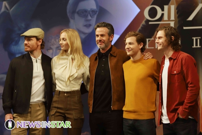 27일 오전 서울시 영등포구 여의도 콘래드 서울에서 영화 ‘엑스맨 : 다크 피닉스’ 내한 기자회견이 열려 할리우드 배우  마이클 패스벤더, 소피 터너, 타이 쉐리던, 에반 피터스, 사이먼 킨버그 감독이 포즈를 취하고 있다.