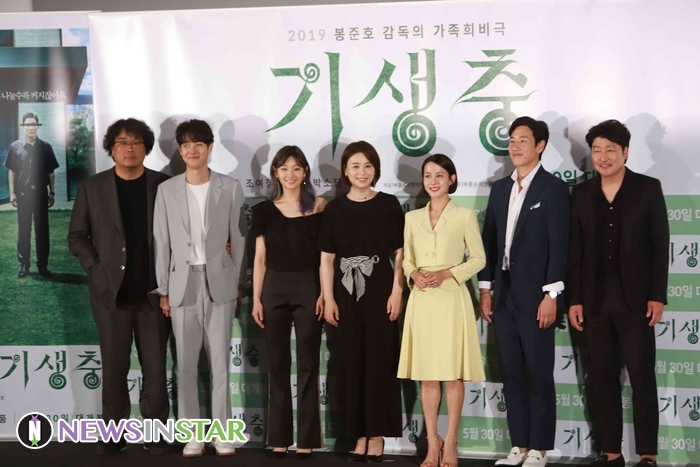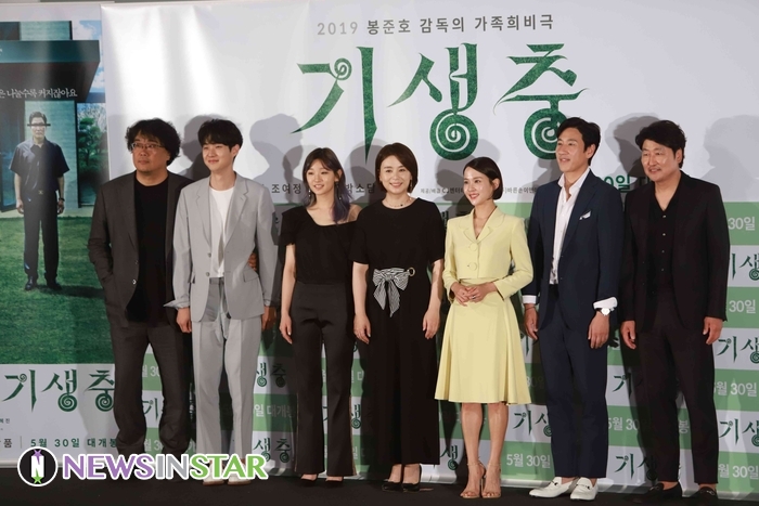 28일 서울시 용산구 CGV 용산아이파크몰에서 영화 ‘기생충’ 언론시사회가 열려 배우 최우식X박소담X장혜진X조여정X이선균X송강호, 봉준호 감독이 참석해 포토타임에 포즈를 취하고 있다.