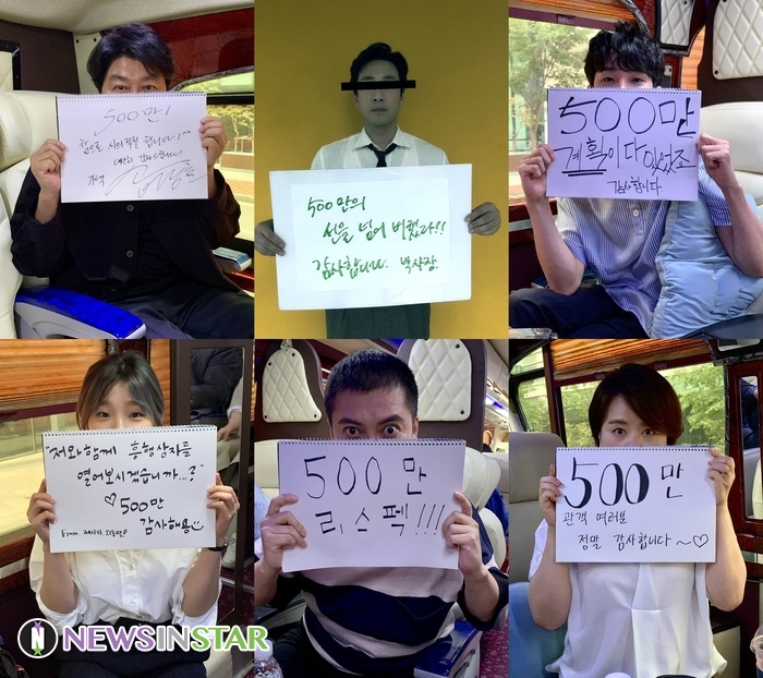 한편, 500만 인증샷에는 '기생충'의 주역인 배우들의 친필 메시지를 통해 관객들에게 감사의 인사를 전해 눈길을 모은다. 먼저, ‘기택’역의 송강호는 “500만 참으로 시의적절합니다! 대단히 감사드립니다”라고 본인의 명대사를 재치있게 인용한 감사 인사로 눈길을 사로잡는다. 여기에 ‘기우’역의 최우식 역시 “500만 계획이 다 있었죠. 감사합니다”, ‘기정’역의 박소담은 “저와 함께 흥행 상자를 열어보시겠습니까? 500만 감사해용”, ‘근세’역의 박명훈은 “500만 리스펙”이라고 영화 속 본인 캐릭터들의 명대사를 센스있게 활용해 소감을 밝혔다. 또한, 촬영 일정으로 함께 인증샷을 찍지 못한 ‘박사장’역의 이선균은 “500만의 선을 넘어 버렸다!! 감사합니다”라며 감사 소감을 따로 보내왔으며, ‘연교’역의 조여정은 “기생충 500만! 정말 감사합니다!!”라는 손편지로 감사의 마음을 전했다. 또한, ‘충숙’역의 장혜진은 “500만 관객 여러분 정말 감사합니다”라는 멘트로 관객들에게 감사 마음을 담아냈다.