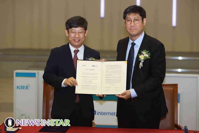 6월 10일 오전 서울시 영등포구 여의도 한국거래소에서 인터넷 포털사이트를 운영하는 '줌 인터넷'의 코스닥 상장 기념식이 열려 이날 김우승 줌인터넷 대표이사가 참석해 정운수 한국거래소 코스닥시장본부장과 상장 계약서 체결식을 진행했다.