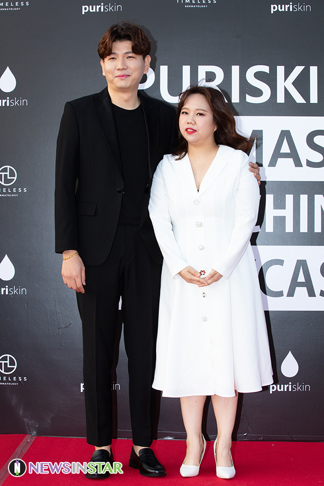 디자이너 제이쓴, 개그맨 홍현희가 12일 오후 서울 영등포구 서울마리나에서 열린 '퓨리스킨 LED 마스크' 론칭 기념 행사에 참석해 포즈를 취하고 있다.