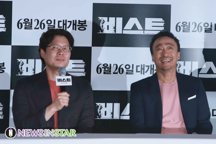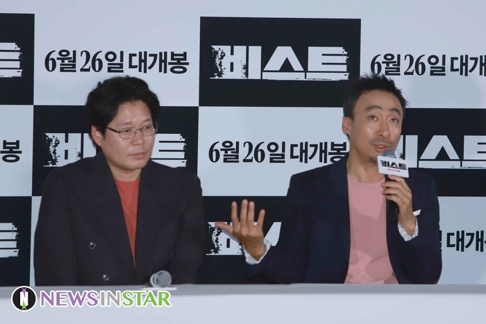 18일 오후 서울시 용산구 CGV 용산아이파크몰에서 영화 '비스트'의 언론시사회가 열려 시사회 종료 후 배우 이성민, 유재명, 전혜진, 최다니엘과 이정호 감독이 참석해 기자 간담회를 갖고 있다. 배우 이성민과 유재명이 기자의 질문에 답변을 하고 있다.