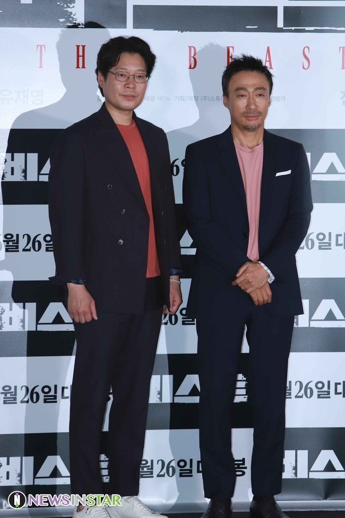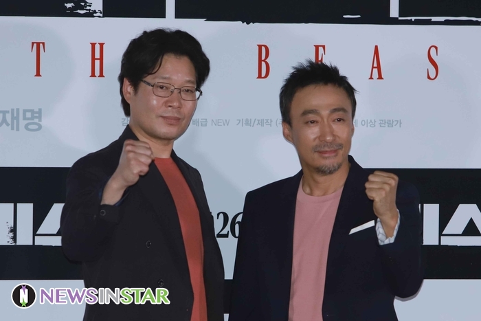 18일 오후 서울시 용산구 CGV 용산아이파크몰에서 영화 '비스트'의 언론시사회가 열려 시사회 종료 후 배우 이성민, 유재명, 전혜진, 최다니엘과 이정호 감독이 참석해 기자 간담회를 갖고 있다. 배우 유재명X이성민이 포토타임을 갖고 있다.