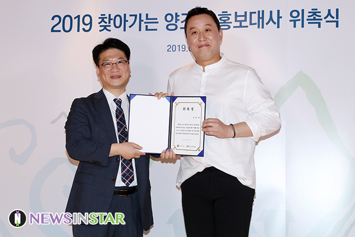 농림축산부 식품산업진흥과 이용직 과장, 개그맨 정준하가 25일 오후 서울 중구 퍼시픽 호텔에서 열린 '2019 찾아가는 양조장' 홍보대사 위촉식에서 포즈를 취하고 있다.