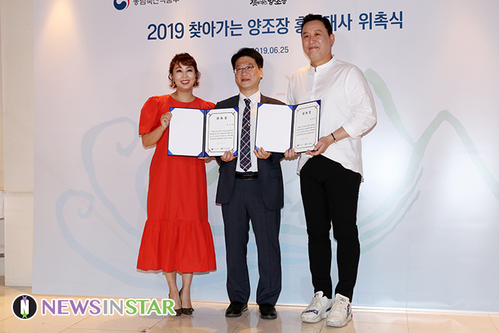 요리연구가 홍신애, 정준하가 25일 오후 서울 중구 퍼시픽 호텔에서 열린 '2019 찾아가는 양조장' 홍보대사 위촉식에서 포즈를 취하고 있다.
