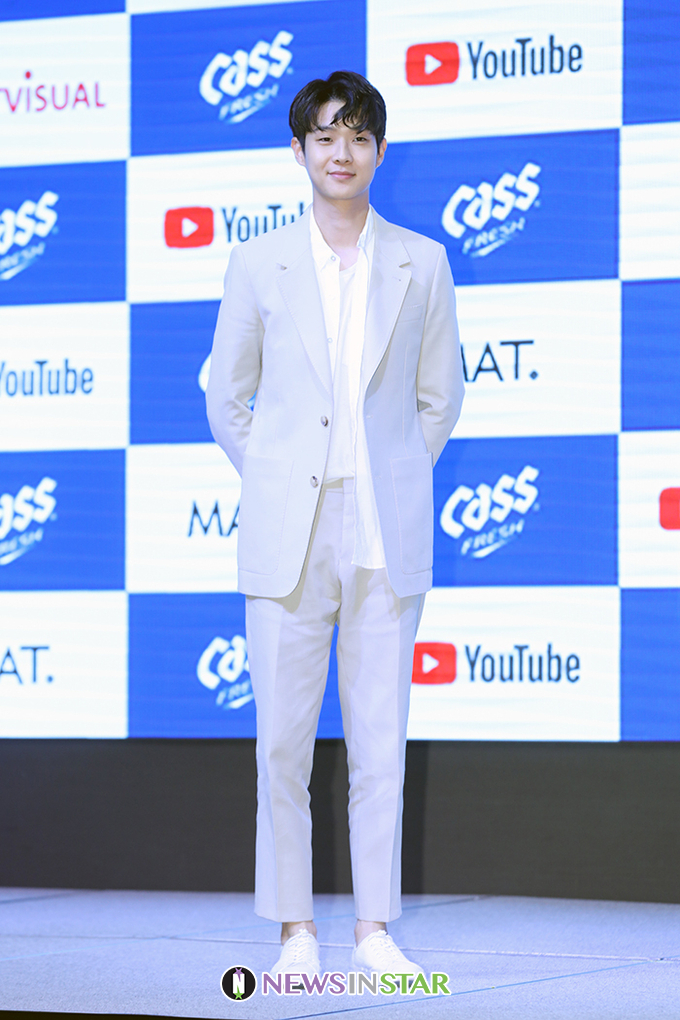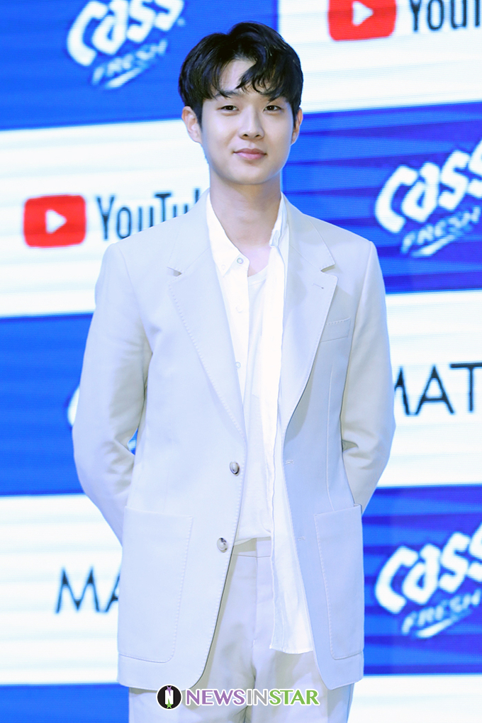 배우 최우식이 12일 오전 서울 영등포구 여의도 글래드 호텔에서 열린 카스 브랜드 필름 '아오르비' 시사회에서 포즈를 취하고 있다.