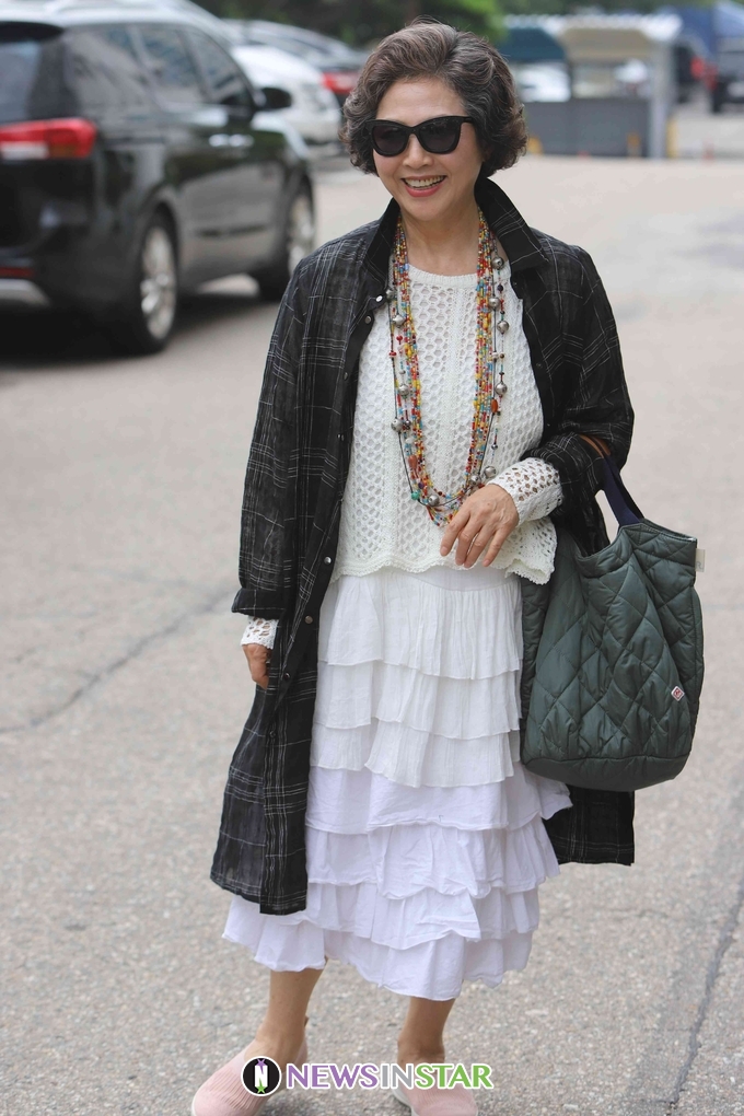 배우 고두심이 출근길에 포즈를 취하고 있다.