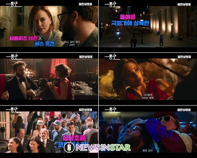 공개된 예고편은 스웨덴 전통 의상을 입은 채 계단에서 터덜터덜 내려오는 ‘프레드’를 보곤 물을 내뿜는 ‘샬롯’ 장면으로 시작, 초반부터 웃음을 자아낸다. ‘샬롯’은 20년 전 ‘프레드’의 과거 베이비시터이자 대선 후보 출마를 선언한 유능한 정치인이다. 그녀는 본인의 연설문을 다듬을 스피치 라이터로 실직 기자 ‘프레드’를 고용하고, 그들은 전 세계로 선거 캠페인을 다니며 예상치 못한 사건을 겪는 등, 마주하는 모든 순간에서 큰 웃음을 만들어 낸다. 이를 입증하는 ‘올여름 극장가에 상륙한 상상초월 코믹버스터!’라는 카피와 예고편 속 “나 오늘 완전 망가질래”라고 말한 ‘샬롯’이 술에 취해 의자에 널부러져 ‘프레드’의 머리카락을 헤집는 장면이 계속되는 재미를 선사한다. 마지막으로 야릇한 분위기 속 ‘샬롯’이 침대 위에서 “네가 상상하던 거 하나 하고, 그다음엔 xxxx 해줘”라고 말해 ‘프레드’가 당황하는 장면은 <롱 샷>이 말맛 넘치는 코미디와 몸 개그뿐만 아닌, 빵 터지는 19금 드립까지 가득 찬 알짜배기 코믹버스터라는 것을 입증한다.