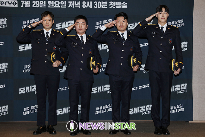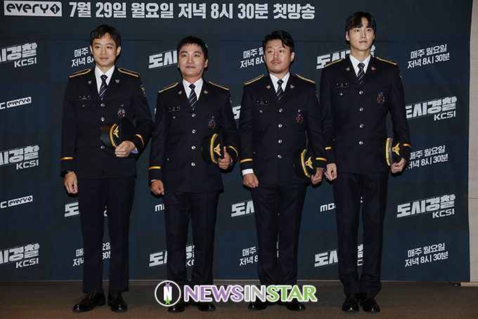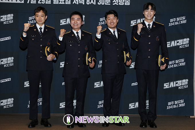 배우 천정명, 조재윤, 김민재, 이태환이 29일 오전 서울 마포구 스탠포드호텔코리아에서 열린 MBC every1 예능 '도시경찰 : KCSI' 제작발표회에서 포즈를 취하고 있다.