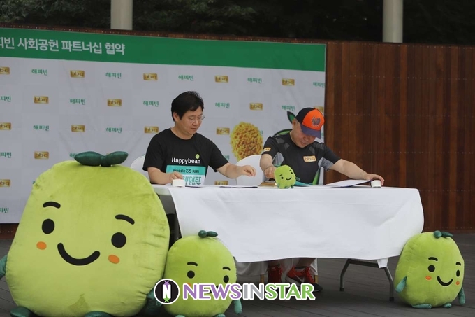 30일 (화) 오전 서울시 동작구 노들나루공원에서 'BBQ X 네이버와 가수 션이 함께하는 아이스버킷 챌린지 런 행사'가 열려 치킨 프랜차이즈 BBQ 윤홍근과 네이버 협약식 서명을 진행 하고 있다.
