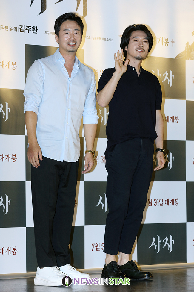 [뉴스인스타=서보형 기자] 배우 류승수, 장혁이 30일 오후 서울 송파구 롯데시네마 월드타워에서 열린 영화 '사자' VIP 시사회에서 포즈를 취하고 있다.