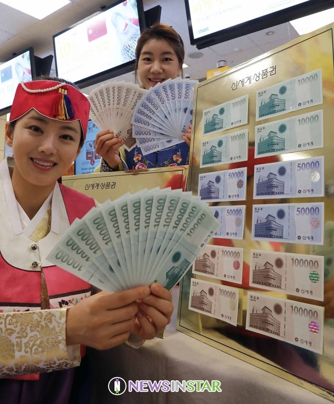 8월 4일 일요일 오전 이마트 성수점에서 모델들이 신세계 상품권을 선보이고 있다.