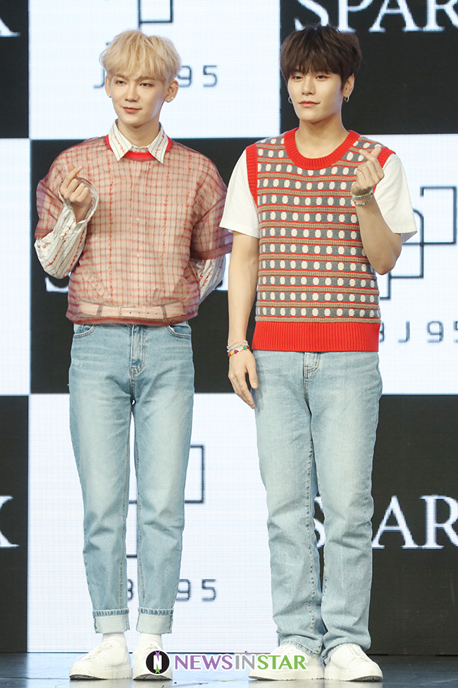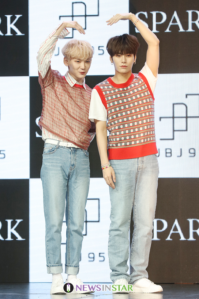 [뉴스인스타=서보형 기자] 그룹 JBJ95의 켄타, 상균이 6일 오후 서울 광진구 예스24라이브홀에서 열린 JBJ95 세 번째 미니앨범 'SPARK(스파크)' 쇼케이스에서 포즈를 취하고 있다.