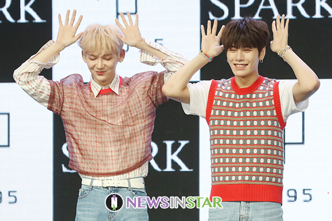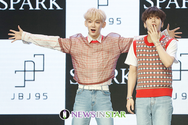 [뉴스인스타=서보형 기자] 그룹 JBJ95의 켄타, 상균이 6일 오후 서울 광진구 예스24라이브홀에서 열린 JBJ95 세 번째 미니앨범 'SPARK(스파크)' 쇼케이스에서 포즈를 취하고 있다.