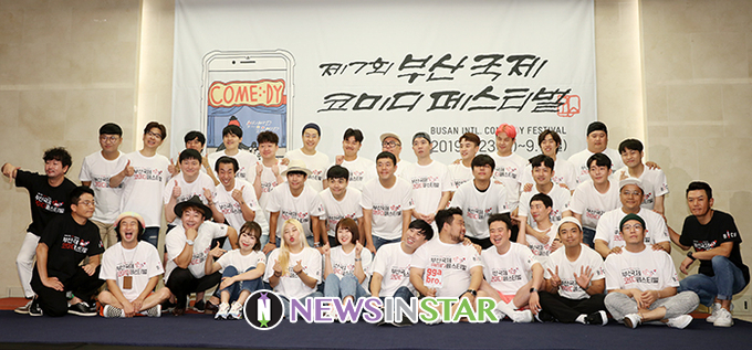 [뉴스인스타=서보형 기자] 조직위, 공연팀이 8일 오전 서울 마포구 스탠포드호텔코리아에서 열린 제 7회 '부산국제코미디페스티벌' 기자회견에서 포즈를 취하고 있다.