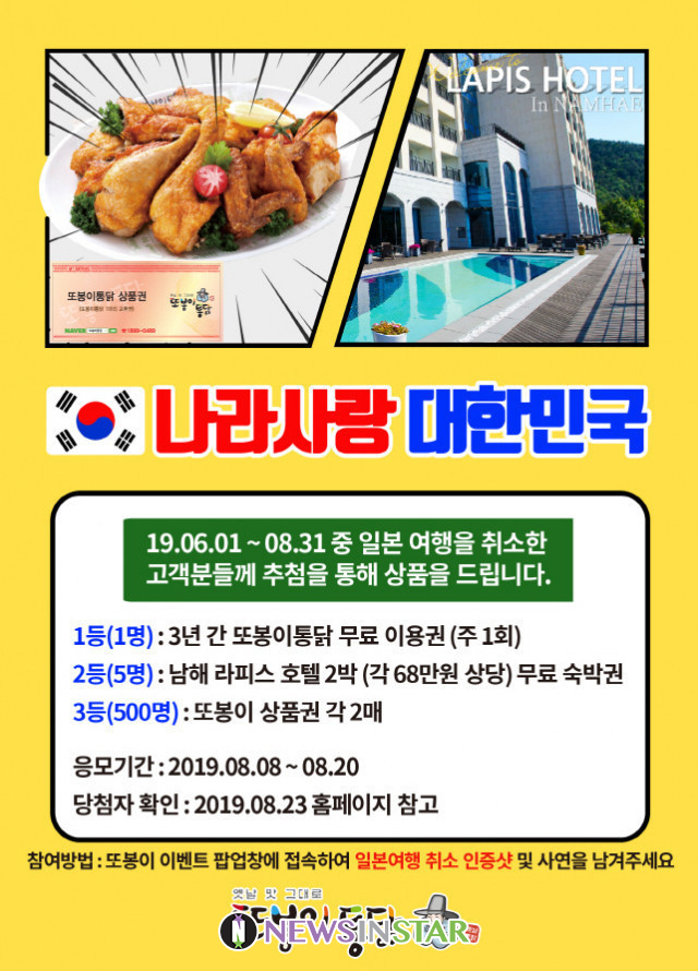 또봉이통닭이 “일본 여행 취소 고객에 다양한 경품을 증정한다”고 8일 전했다. 또봉이통닭의 이번 ‘애국마케팅’은 올해 6월 1일부터 8월 31일 사이로 예정돼 있던 일본 여행을 취소한 고객을 대상으로 진행하는 것으로, 항공권(호텔) 취소 인증샷 및 사연을 또봉이통닭 홈페이지에 올리면 응모할 수 있다.