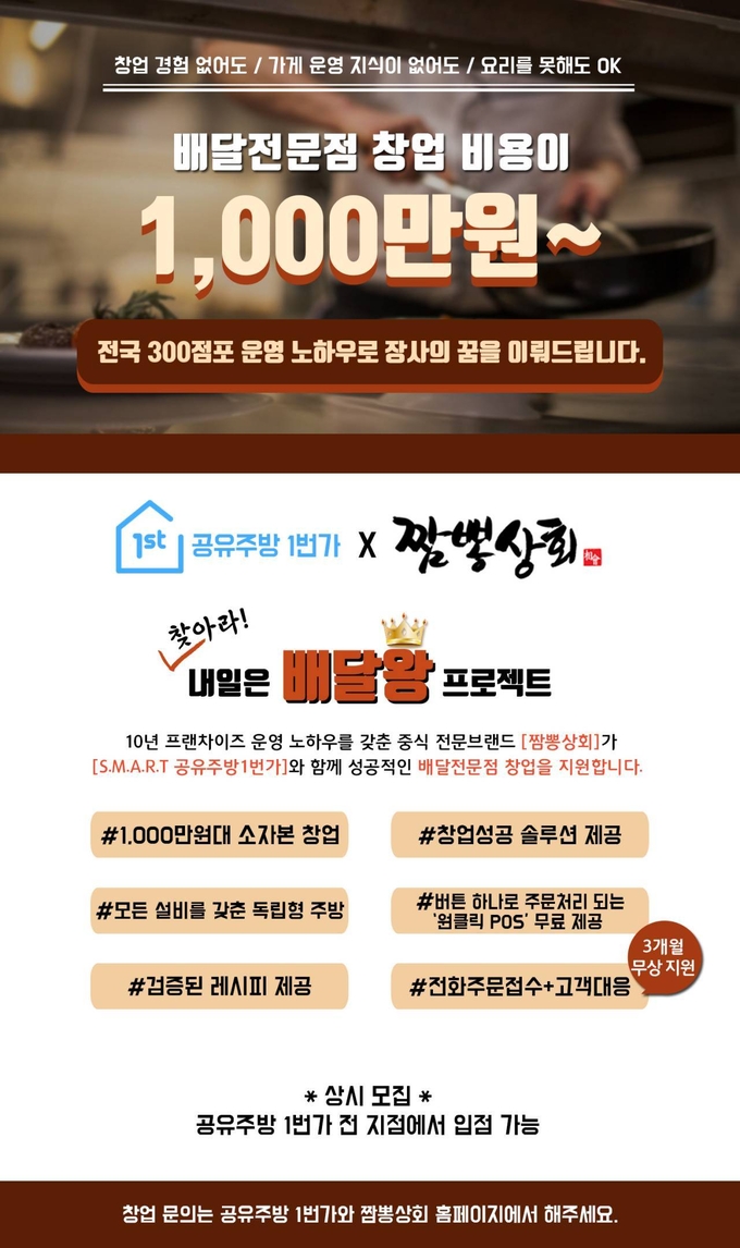 한편 공유주방 1번가는 배달 현장에서 오랫동안 경험을 쌓은 외식업 전문가들이 장사에 필요한 시스템만 갖춰서 만든 스마트한 공유주방으로서, 전국 맛집 프랜차이즈 본사와 제휴하여 창업을 희망하는 고객이 해당 브랜드를 1번가 내에서 저렴한 비용으로 창업할 수 있도록 지원하고 있고, 짬뽕상회는 10년간 40여개의 전국구 프랜차이즈를 안정적으로 운영한 노하우를 바탕으로 ‘NO 주방장 제도’를 마련, 전문 인력 없이 매장을 운영할 수 있도록 본사에서 레시피와 식재료, 소스 등을 100% 제공하는 시스템을 갖추고 있다.