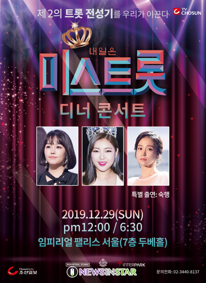 ‘미스트롯’ 진, 선, 미를 차지한 송가인, 정미애, 홍자가 다가오는 연말 12월 29일(일) 임피리얼 팰리스 서울 호텔에서 개최한다고 알리며 화제를 모으고 있다.