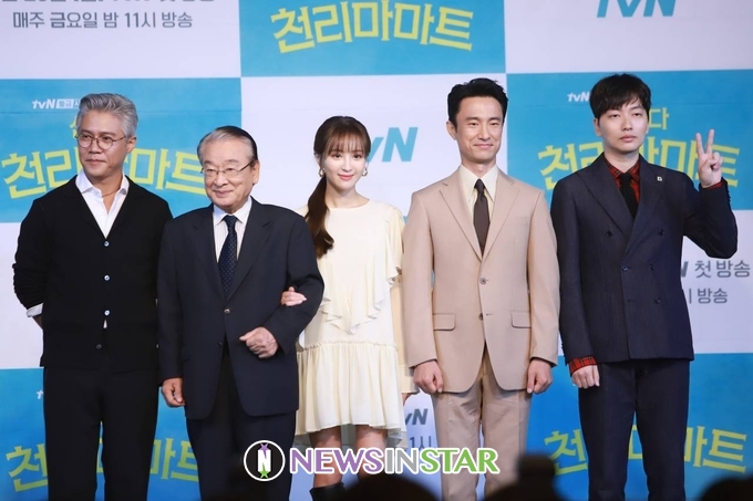 16일 오전 서울시 마포구 도화동 베스트웨스턴프리미어 서울가든호텔에서 tvN 새 금요드라마 '쌉니다 천리마마트' 제작발표회가 열려 배우 박호산X이순재X정혜성X김병철X이동휘가 참석해 포토타임을 갖고 있다.