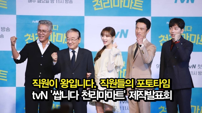 16일 오전 서울시 마포구 도화동 베스트웨스턴프리미어 서울가든호텔에서 tvN 새 금요드라마 '쌉니다 천리마마트' 제작발표회가 열려 배우 박호산X이순재X정혜성X김병철X이동휘가 참석해 포토타임을 갖고 있다.