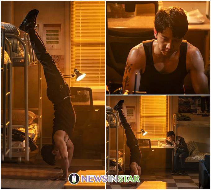 이와 관련 이승기가 CG가 의심될 만큼 완벽하고 정교한 자세로 물구나무서기를 해낸 모습이 포착됐다. 극중 차달건이 테러 용의자 김우기(장혁진)를 감시하는 동시에 체력을 다지고 있는 장면으로, 차달건은 두 팔에만 온전히 체중을 의지한 채 거꾸로 서는 물구나무 포즈를 취한 후, 땀을 흘리며 숨을 고르는 모습이다. 차달건의 탄탄한 근육질 팔뚝과 그 위에 새겨진 ‘戰神(전신)’ 문신이 단연 시선을 잡아채는 가운데, 그 옆에 수갑을 찬 김우기는 차달건의 진기한 묘기가 내심 놀라운지 허겁지겁 죽을 들이키면서도 힐끔힐끔 쳐다보고 있어 눈길을 끈다.