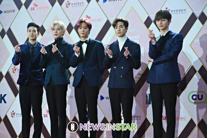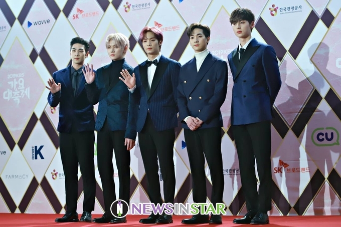 이날 포토월에 그룹 뉴이스트(NU'EST) JR, 아론, 백호, 민현, 렌이 참석해 포즈를 취하고 있다.