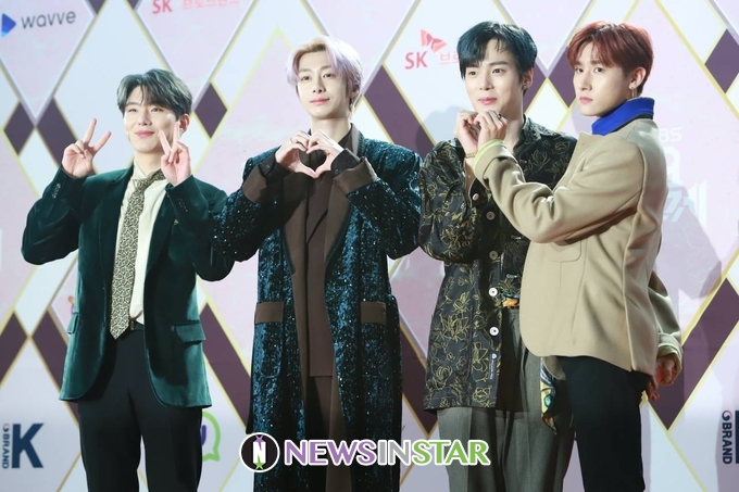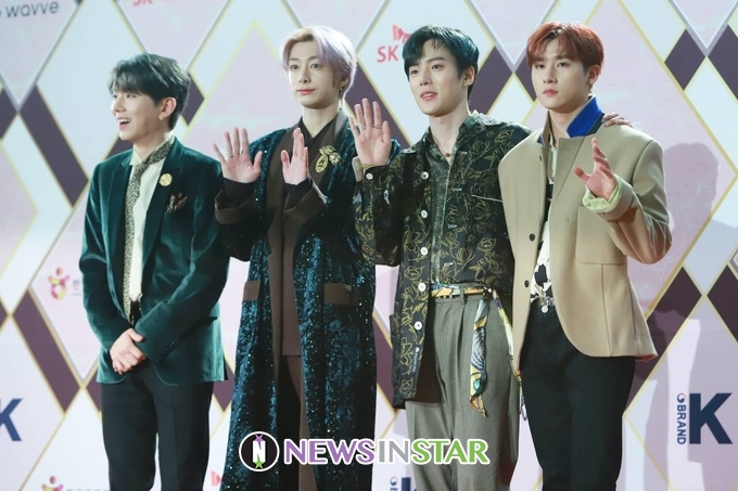이날 포토월에 그룹 몬스타엑스(MONSTA X) 민혁, 기현, 형원, 아이엠 참석해 포즈를 취하고 있다.