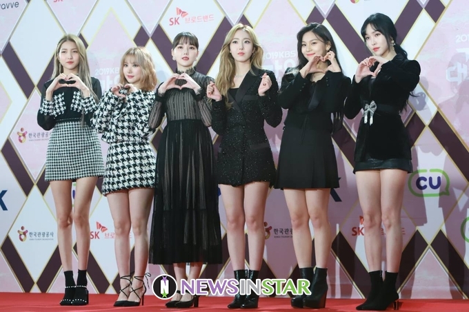 이날 포토월에 그룹 여자친구(GFRIEND) 소원, 예린, 은하, 유주, 신비, 엄지가 참석해 포즈를 취하고 있다.