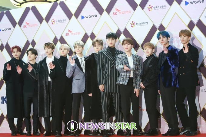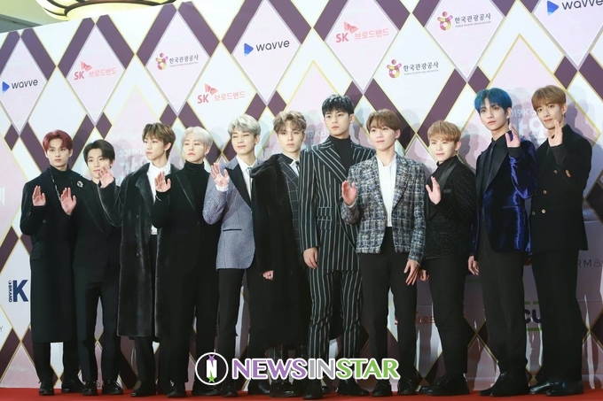 이날 포토월에 그룹 세븐틴(Seventeen) 조슈아, 준, 호시, 원우, 우지, 디에잇, 민규, 도겸, 승관, 버논, 디노가 참석해 포즈를 취하고 있다.