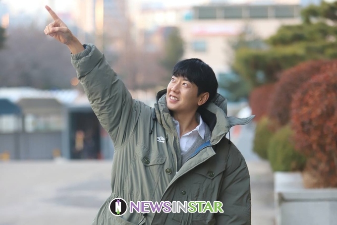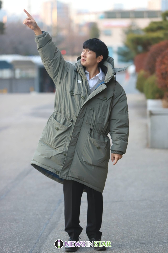 이날 태사자 김형준이 출근길에 포즈를 취하고 있다.