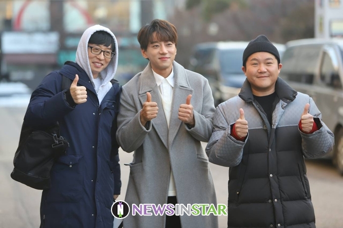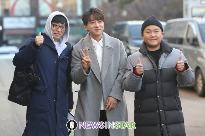 이날 유재석, 조세호, 황치열이 출근길에 포즈를 취하고 있다.